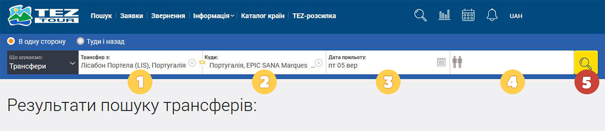 Після внесення необхідної інформації слід клікнути на кнопку «Пошук трансферів» під формою пошуку або піктограму, відміченою на схемі під №5 та дочекатися отримання результату.